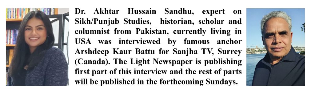 Dr. Akhtar Hussain Sandhu, expert on Sikh/Punjab Studies, historian, scholar and columnist from Pakistan, currently living in USA was interviewed by famous anchor Arshdeep Kaur Battu for Sanjha TV, Surrey (Canada). The Light Newspaper is publishing first part of this interview and the rest of parts will be published in the forthcoming Sundays.